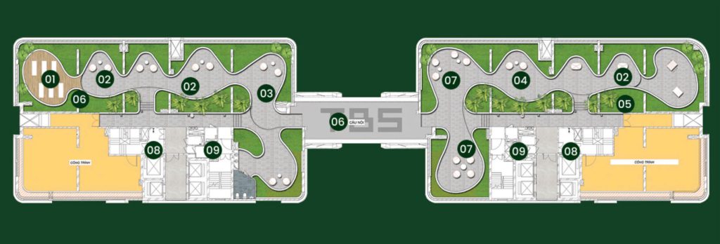 Từ khối đế với cảnh quan nhiệt đới mềm mại đến kiến trúc tháp vươn cao thanh thoát, GREEN SKY LINE mang đến một tổng thể hài hòa giữa thiên nhiên – ánh sáng